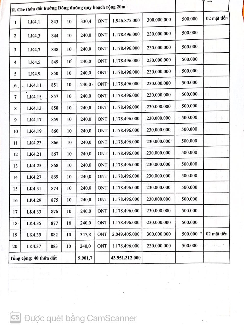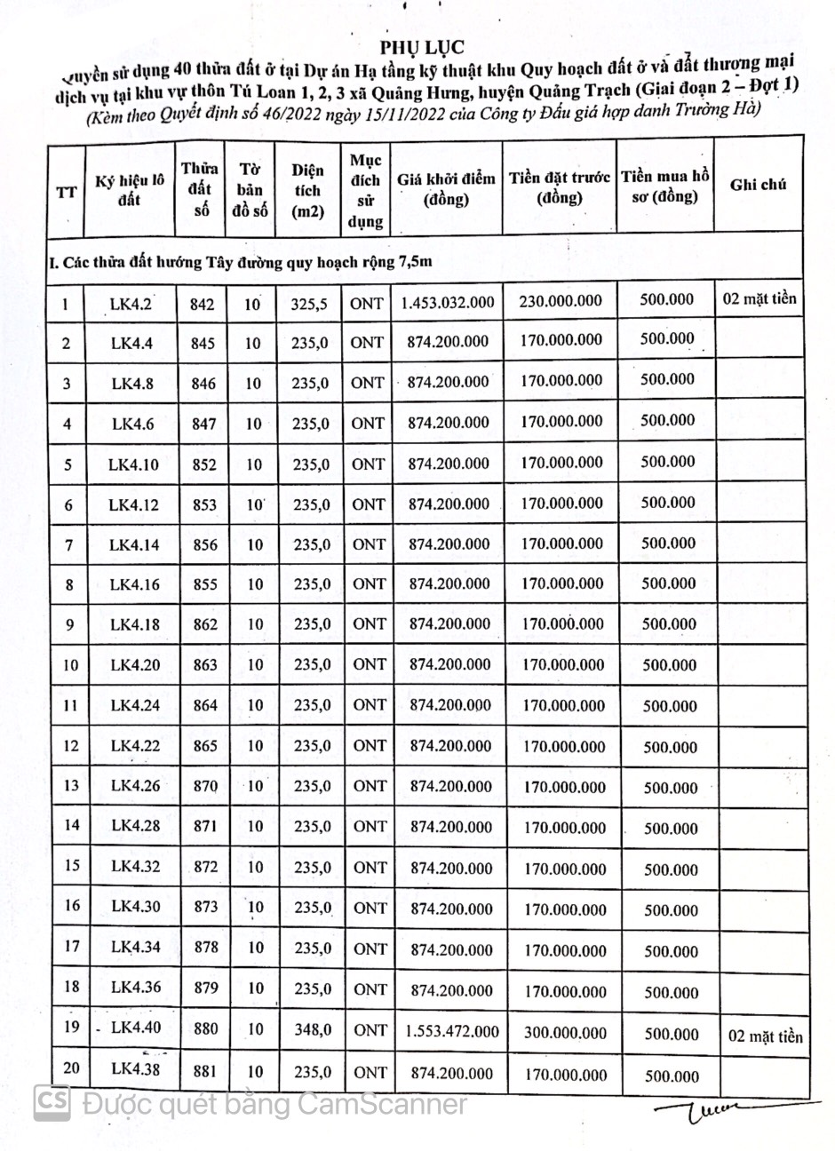 - Đợt 1, từ ngày 21/11/2022 đến ngày 05/12/2022, tổ chức đưa ra đấu giá quyền sử dụng 40 thửa đất (diện tích 9.901,7 m2; tổng giá khởi điểm 43.951 triệu đồng), có diện tích từ từ 235 m2/thửa đến 348 m2/thửa; Giá khởi điểm từ 874.200.000 đồng/thửa đến 2.049.405.000 đồng/thửa. Thông tin các lô đất đấu giá xem Phụ lục 1, Phụ lục 2.