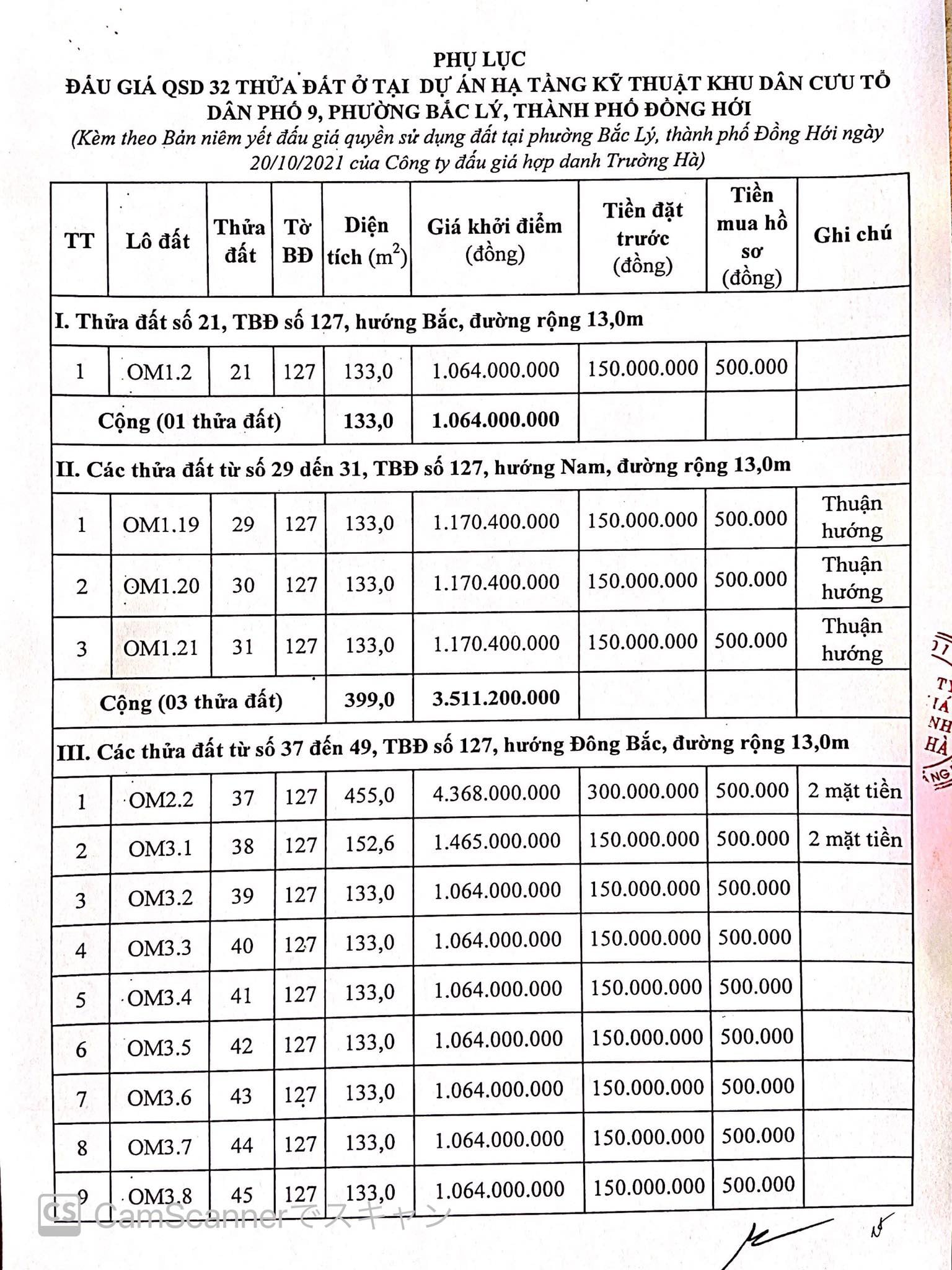 Đợt 1: Từ ngày 20/10/2021 đến ngày 04/11/2021đưa ra đấu giá 32 lô đất (tổng diện tích 4995,4 m2) với giá khởi điểm 41.243 triệu đồng.