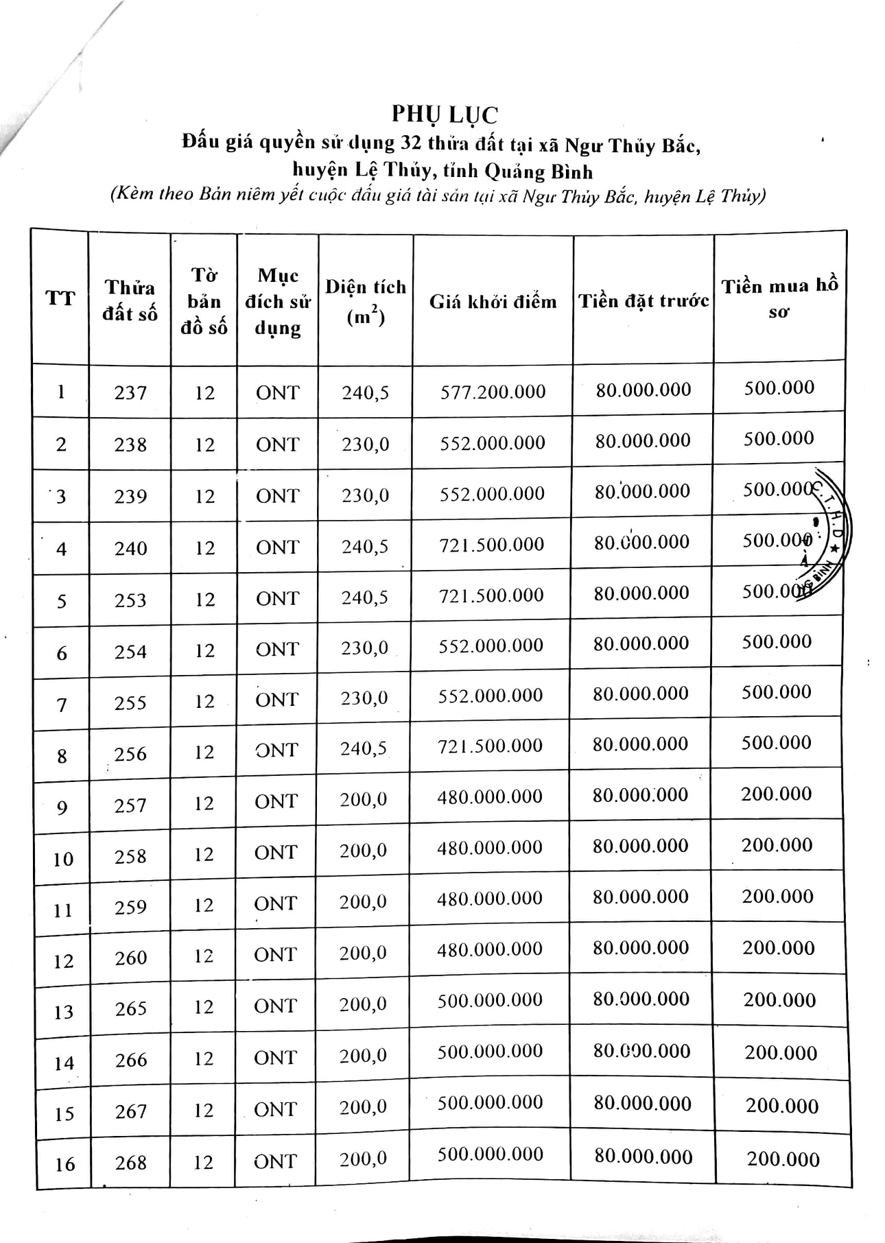 Liên hệ: Công ty Đấu giá hợp danh Trường Hà SĐT: 0232.3896333; Ban quản lý dự án Đầu tư xây dựng và Phát triển quỹ đất huyện Lệ Thủy SĐT: 0232.3961222