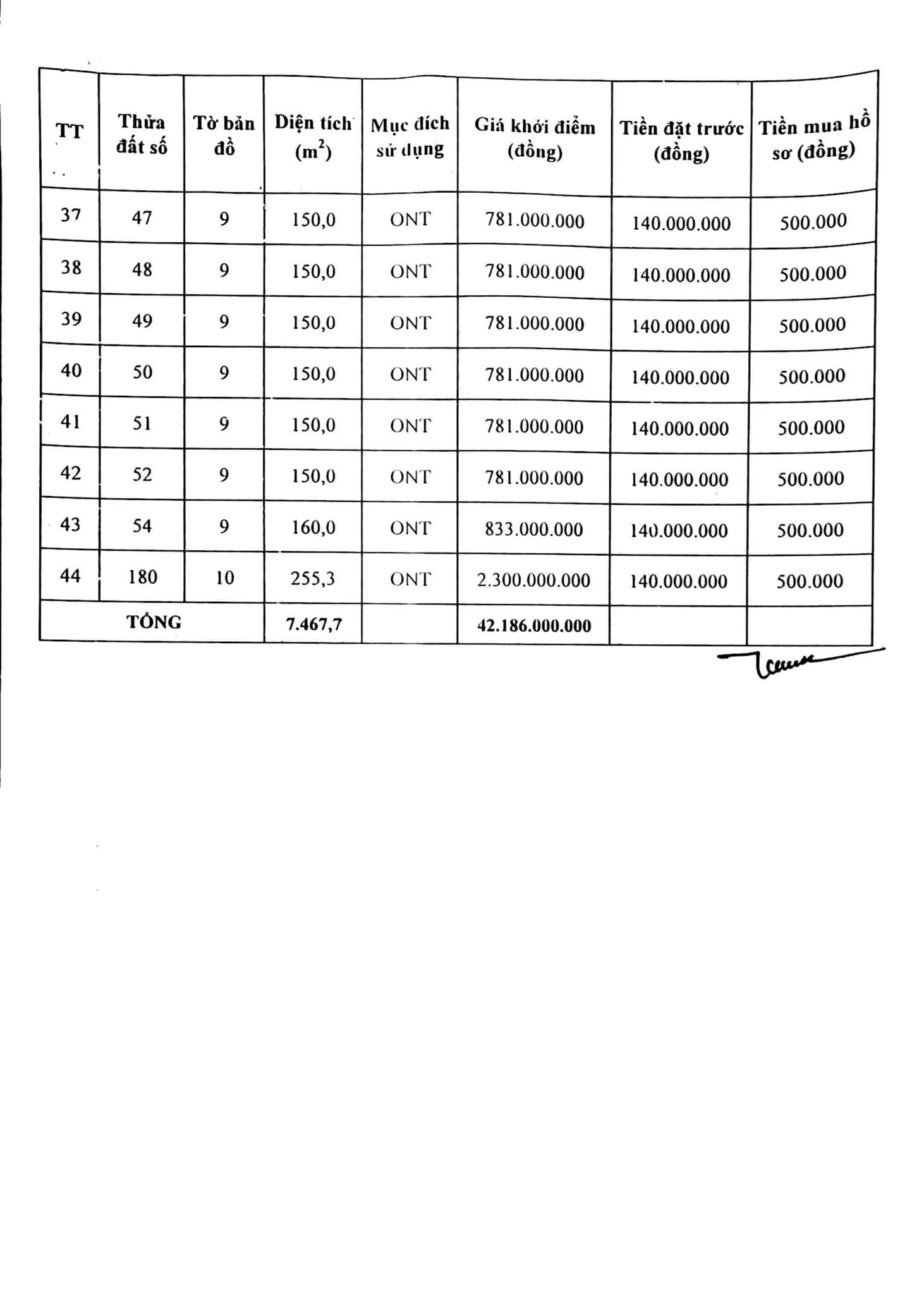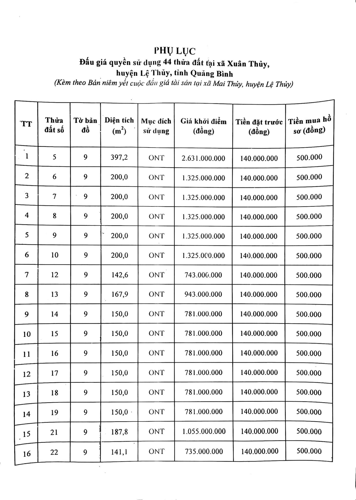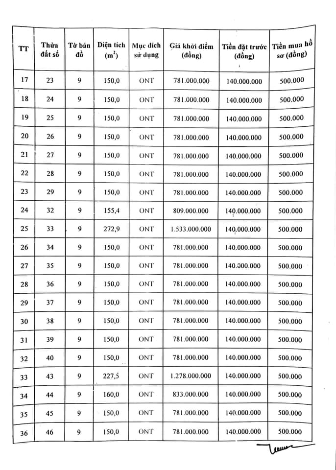 - Đợt 1 đưa ra đấu giá 44 lô đất (tổng diện tích 7.467,7m2) có diện tích từ 150m2 đến 397,2 m2/lô; giá khởi điểm từ từ 735.000.000 đồng/lô đến 2.631.000.000 đồng/lô. Xem thông tin các lô đất phụ lục 1, phụ lục 2, phụ lục 3
